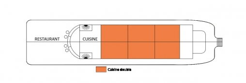 6 cabines doubles avec fenêtre donnant sur les coursives extérieures Commodités / Equipements / services à bord: Coffre-fort Coiffeuse Climatisation Electricité 220V Salle d’eau avec lavabo, douche, WC et sèche-cheveux Peignoirs Grands espaces de rangement NB : il n'y a pas d'ascenseur à bord.