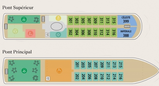 Suites Terrasse d’exception au pont Supérieur, les suites Céleste et Impériale dont la superficie varie de 85 à 105 m², avec terrasse de 16,8 à 18,5 m² sont équipée de transats, table et chaises. Un salon privatif permet de recevoir en toute intimité.