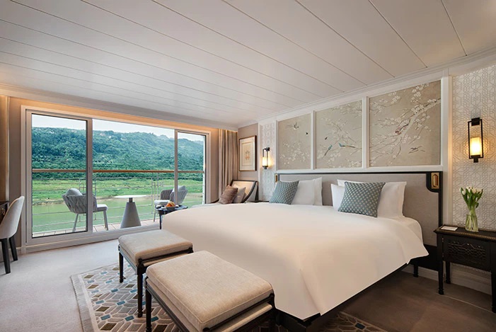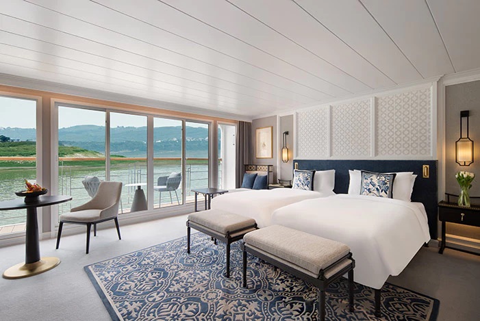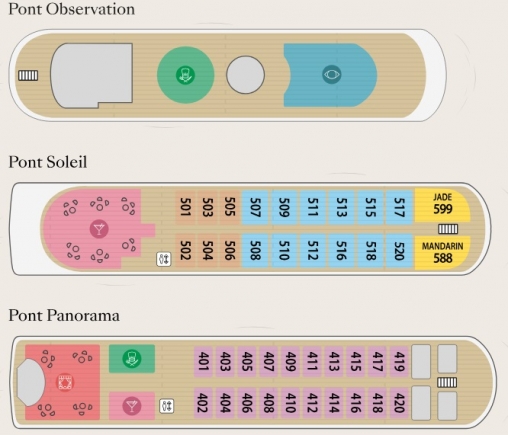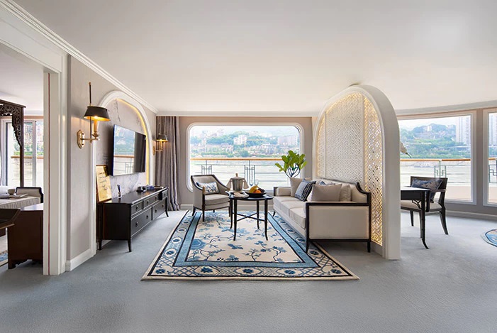 Suites Terrasse d’exception au pont Supérieur, les suites Céleste et Impériale dont la superficie varie de 85 à 105 m², avec terrasse de 16,8 à 18,5 m² sont équipée de transats, table et chaises. Un salon privatif permet de recevoir en toute intimité.