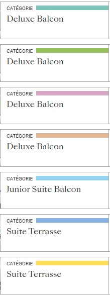 Les Suites Terrasse d’exception du pont Soleil Mandarin et Jade dont la superficie varie de 85 à 105 m², avec terrasse de 16,8 à 18,5 m² sont équipées de transats, table et chaises. Un salon privatif permet de recevoir en toute intimité.