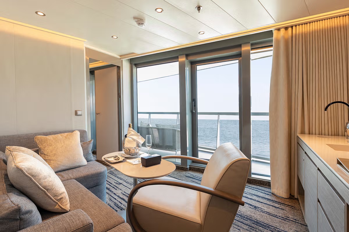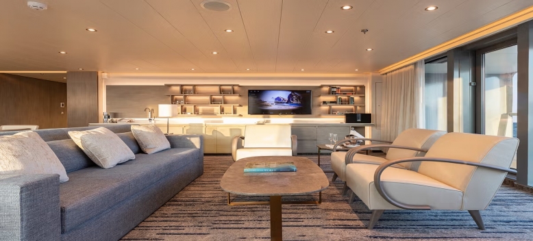 Les essentiels Pont(s): 6 Catégorie: Partie arrière Caractéristiques Véranda Salle à manger indépendante Salle de séjour avec coin salon Meuble-lavabo double vasque Douche séparée Baignoire balnéo Dressing avec coffre-fort personnel Meubles Lit king size Bureau d'écriture Coiffeuse Matelas luxueux sur mesure Médias et communication Wi-Fi premium illimité 2 grandes télévisions à écran plat avec médiathèque interactive Système audio avec connectivité Bluetooth Téléphone à ligne directe Chargeurs muraux pour appareils mobiles USB-C Prises double tension 110/220 Services à bord Service de majordome Blanchisserie, pressing et nettoyage humide complémentaires Vin mousseux à l'arrivée Équipements Machine à expresso Bouilloires Menu d'oreillers Réfrigérateur et bar approvisionnés selon vos préférences Peignoir Produits de toilette de luxe Parapluie Sèche-cheveux Pantoufles